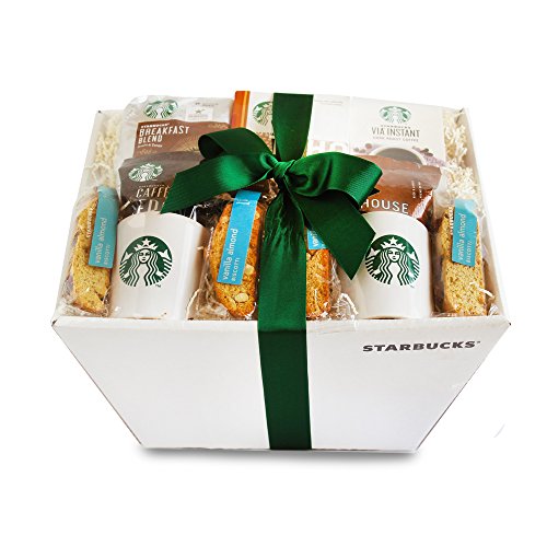 -. Feature : Enjoy three delicious blends of Starbucks's coffee, house blend, breakfast blend and French roast / Two ceramic Starbucks's logo mugs-great for the kitchen and office / A box of salted caramel hot chocolate and 1 via ready-brew caramel flavored coffee-perfect for those on the go / 4 yummy spiced chocolate biscotti, great for dipping in hot beverages / San Francisco brand TCHO's organic chocolate bar