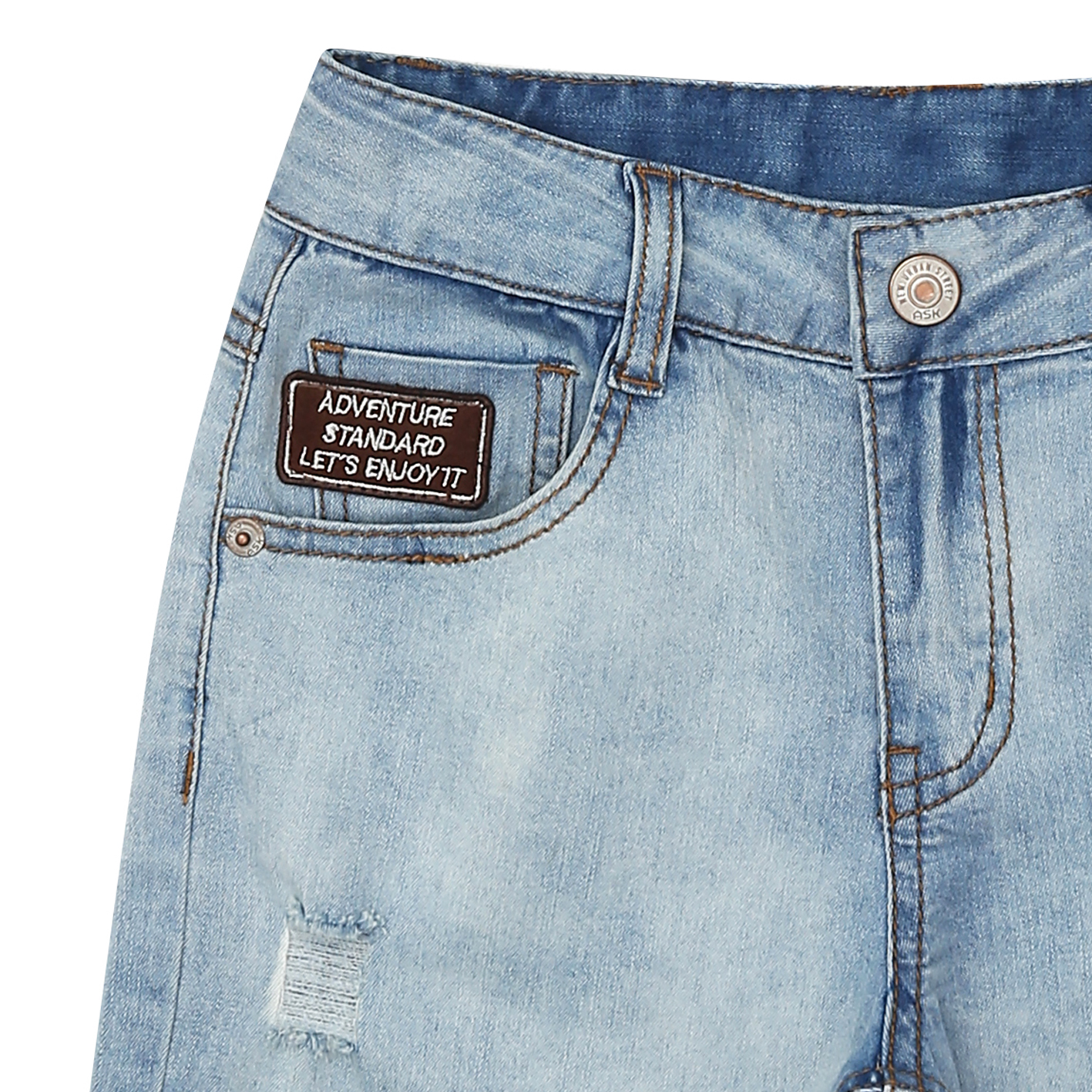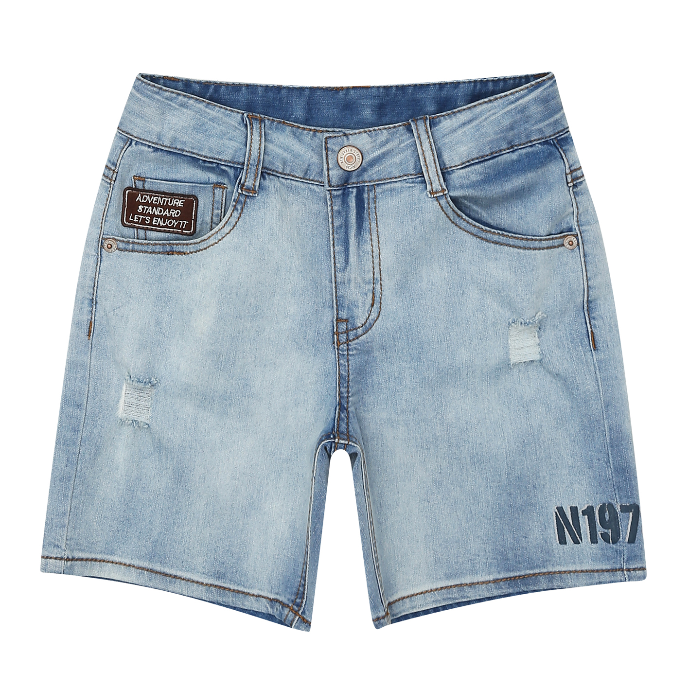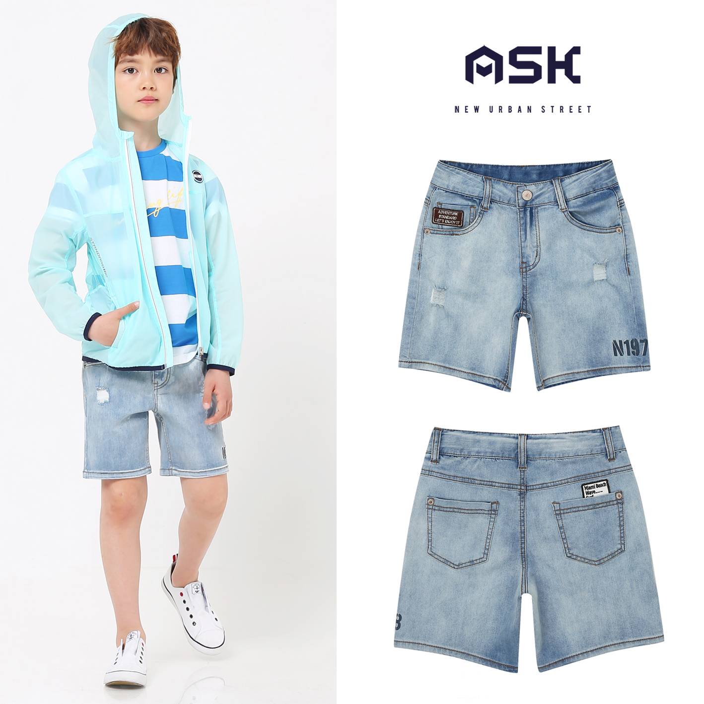 밝은 아이스톤 워싱의 오픈형 4.5부 데님팬츠로, 한여름에 COOL한 느낌의 활동성 좋은 유니 아이템.