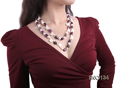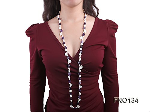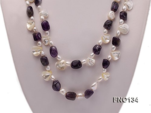 This is a fabulous necklace made with 9x13mm purple irregular amethyst, white irregular mabe pearl and white pearl beads. There is no clasp used in this necklace and the whole length is 44 inches.