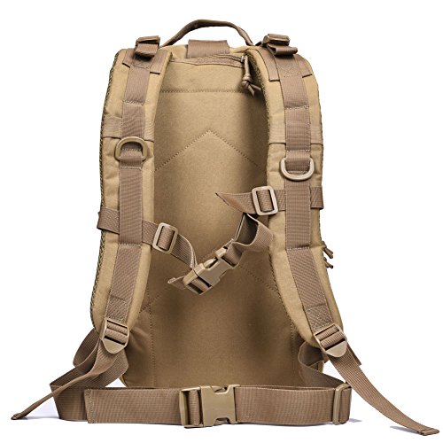Studio : REEBOW GEAR Publisher : REEBOW GEAR Binding : Misc. Product Description Desc.: Military Tactical Backpack with Tactical US Flag Patch Tan Tactical assault backpack Capacity: 34L. Size approx.:11"*18"*12" (W*H*D), it's not big backpack; Military backpack is made of high density fabric--durable and water-resistant. Tactical backpack has molle system, MOLLE is a little different as most tactical molle bacpkacks and is not to spec. Spacing between of molle is less than 1/2". Military backpack with double-stitched, Heavy duty zippers and utility-style cord pulls, Side and front load compression system, Comfortable padding back area, Ventilated mesh padding shoulder strap. Tactical backpack has hydration compatible that works great for a 2.5L hydration bladder(backpack didn't include hydration bladder). Notice: Tactical assault pack backpack's waist straps and chest straps are removable, please check straps before you use it in order to avoid straps fell off and lost. 0