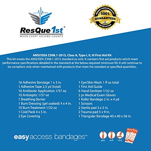-. Binding : Health and Beauty -. Brand : ResQue1st -. EAN : 0688713065242 -. Feature : COMBO EMERGENCY PREPAREDNESS AND FIRST AID KIT - Perfect For Up to 25 People · Home · Office · Auto · Boat · Camping · Outdoors / EASY ACCESS POCKET SYSTEM · Includes Advanced And Patented Easy Access Adhesive Bandages · The Patented Easy Access Pocket System · Which Makes Finding The Right Items Fast and Easy Even Under Duress / BE PREPARED · Always Have the Perfect First Aid Kit on Hand in the Event of an Emergency · Contains the Right Items to Save A Life / HIGH QUALITY FIRST AID ITEMS · Great P.R.Ice · Great Quality · Comprehensive Pocket System · Hospital Grade Pieces · Complete Kit / OSHA ANSI ISEA Z308.1-2009 COMPLIANT · Has Everything You Need Legally For A Business and Several Bonus Items That Complete This First Aid Kit · OTHER USES FIRST AID Bug Out Bag, Kitchen, First Aid Kit Survival, Comparable to the American Red Cross First Aid Kit, Complete List of Items Below -. IsAdultProduct : 0 -. Label : ResQue1st -. Manufacturer : ResQue1st -. MPN : ANSIClassA -. PackageQuantity : 1 -. PartNumber : ANSIClassA -. ProductGroup : Health and Beauty -. ProductTypeName : HEALTH_PERSONAL_CARE -. Publisher : ResQue1st -. Studio : ResQue1st -. Title : ResQue1st Complete ANSI Class A 2016 First Aid Kit · Emergency Preparedness Kit · Business · Home · Camping · Boat · Outdoors · Sports -. UPC : 688713065242