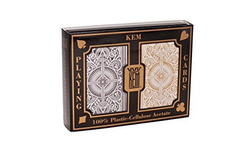KEM Plastic Playing Cards is a 60-year-old company specializing in one product—playing cards which are 100% cellulose acetate plastic. KEM plastic playing cards contain no vinyl, which is the raw material used by all other playing card manufacturers for their "plastic" playing cards.A set-up consists of one black deck and one gold deck. The cards come in a hard black plastic KEM box. One joker is present with each deck. The dimensions of the cards are 2-1/2 inches wide x 3-1/2 inches tall.(Poker Size) KEM cards can handle the wear and tear like no other brand of card in the industry. KEM’s high performance cards will last longer, shuffle better, and deal in such a manner that you will never want to play with anything else again.Feature
