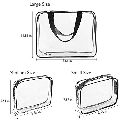 - * 3 DIFFERENT SIZES: 1 x Large clear bag. Dimension (LxWxH) 11.81" x 3.94" x 8.66"; 2 x Medium clear bag. Dimension (LxWxH) 9.45" x 1.96" x 7.87"; 2 x Small clear bag. Dimension (LxWxH) 7.08" x 1.57" x 5.51" .