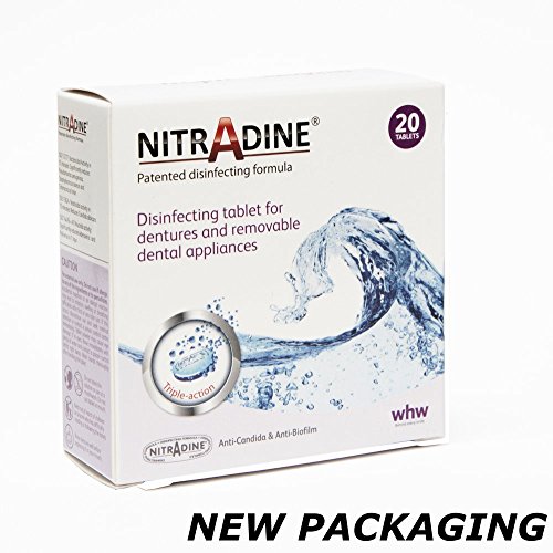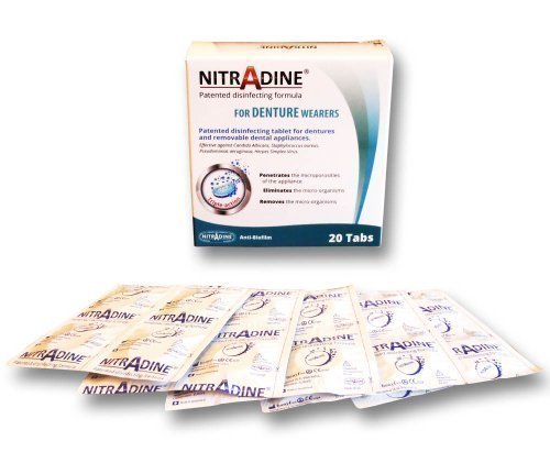 -. Feature : Patented disinfecting tablet for cleaning dentures and other removable dental appliances. / Buy nitradine denture seniors to clean & disinfect : acrylic dentures & plates, metal chrome dentures, flexible dentures & other dental appliances / Works effectively after only 15 minutes on all types of removable dental appliances. / Recommended dosage : one tablet two times per week. / Now sold in larger box sizes of 20 tablets a 10 week supply
