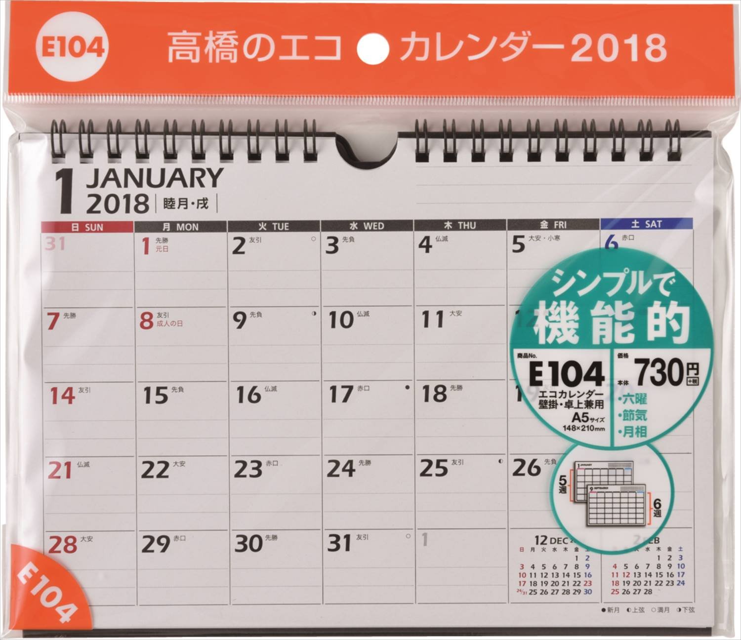 Takahashi book store's "Schedule Note Calendar A 5 E 181" that I have been using for a long time this year was a very nice feeling, so I thought next year (2018) will use the same thing as this I could not find it anywhere so I contacted the head office of Takahashi store by phone. Then a young male employee came out, and it was a reply that "E 181 has been discontinued." If so, there is no choice, so if you ask "What is the product that replaces E181 then then" I will answer "There is no substitute item." "No, no matter if it is not a successor product, even if there is any product similar to E181", "It is told to notify customers that there is no alternative product from E181 from the company In the end saying that ". "So, does not it have to be the same? Do you have any similar products?" Asked "If so, E104, else this or this or this or this ... ..." I am really irritated! ! "Well then, what is the difference between this E 104 and previous E 181?" When asked, "... · · ·. (Silent) Apparently this Takahashi store can do a good explanation of the item I do not see any employees. Well Oh Because it is a product of about 800 yen, I thought that it would not be such a big hurting even if it was not easy to use, so I decided to purchase this item "I thought it was deceived." And the conclusion! It is simple to carry in a bag because the simple page every month like the one in the photograph has for 12 months, it folds and it does not bulk like the notebook. When standing on the desk, it can be stably set since it can be fixed easily by inserting the cut portion of the back cover into the hollowed out portion of the cover. (By the way E181 could not do this.) Since the clasp part at the top of the calendar is designed to be hooked on the hook, it can be used as a wall hanger. Unlike E181, the number of pages has been reduced and the weight and weight are reduced because no plastic plate or cardboard is used. As a result of this, I think that I will be able to spend a year comfortably with this E104 calendar next year. (Why can not Takahashi store employees explain this degree?)