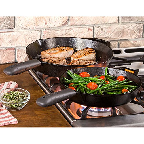 -. Feature : 10.25" Skillet 12" Skillet Two Black Silicone Hot Handle Holders / Pre-seasoned Cooking Surface / Use on All Cooking Surfaces / Oven Safe