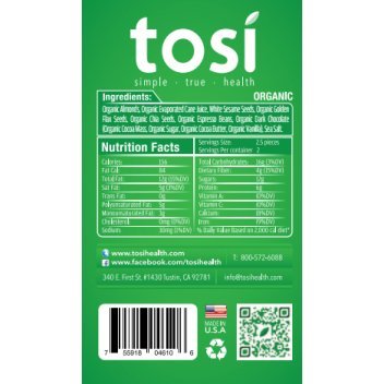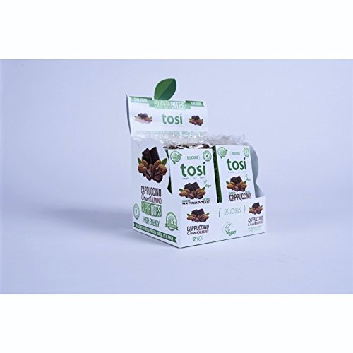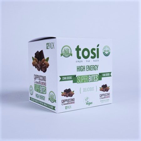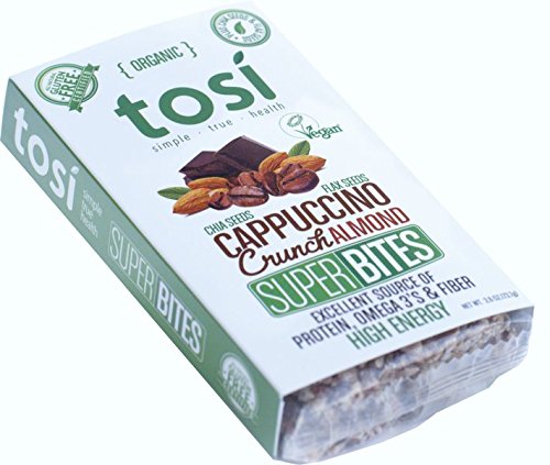 Studio : Tosi Health Publisher : Tosi Health Binding : Health and Beauty Product Description Cappuccino Almond Tosi Health SuperBites, 2.6 ounce bars, 12 bars per box SuperBites are vegan, gluten free, made with chia seeds and flax seeds, and high in energy, fiber, and omega 3's made with organic espresso beans and dark chocolate. SuperBites have a 12 month shelf life. The expiration date can be found printed on the back of the box as well as on the clear plastic sleeve of each individual bar. Each box is taped shut to prevent handling damage. Each bar is cut into 5 segments, totaling 2 full servings per bar 0