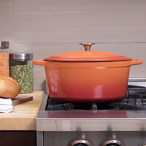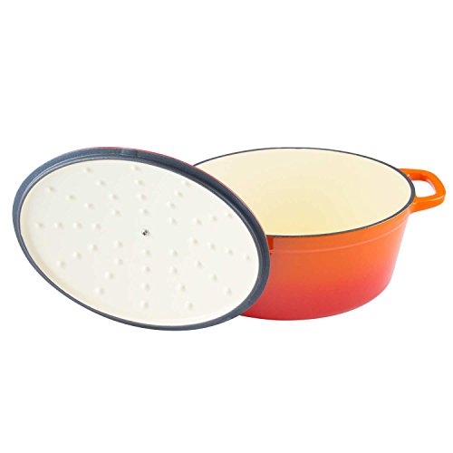 Benefits to using the Zelancio Enameled Cast Iron Dutch Oven: Superior heat distribution and retention ensures an even cooking temperature throughout. Three layers of porcelain enamel are chip resistant. Solid cast iron loop handles for easy transport from stove top to oven. Condensation bumps on the lids interior for self basting. Broiler and oven safe up to 500 degrees F.