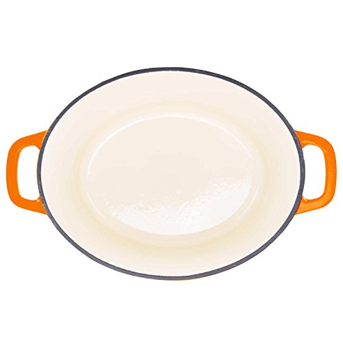 DUTCH OVEN: 6 quart cooking capacity with oval shape. Enameled solid cast iron construction with vibrant contemporary colors and design.