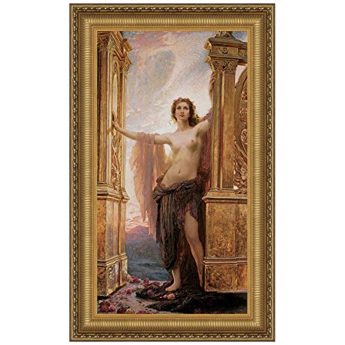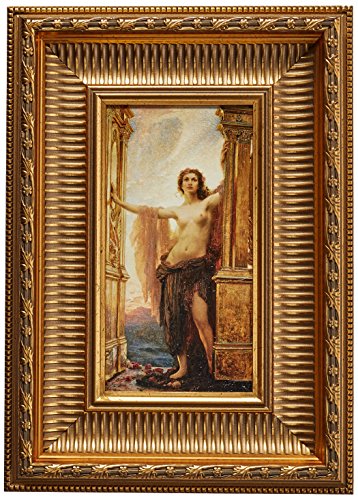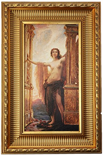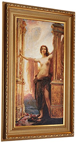 Aurora, Roman goddess of the dawn, throws wide the shining doors of morning, the discarded roses at her feet belying her inexhaustible passion. The Victorian sensibilities of the artist's contemporaries were disturbed as they easily identified Draper's extraordinarily sexualized figure as a popular model of the day, Florrie Bird. Though Draper's largely nude female figures were not popular in the artistic circle of his day, his skill is recognized in our time. The authentic stretched canvas replica painting captures the original works texture, depth of color, and even its subtle brushstrokes, which are applied by hand exclusively for Design Toscano. Our replica European style, bright gold-toned, ribbed frame is cast in quality designer resin with an acanthus leaf and floret border that draws the eye toward the beautiful image. Large: 23"Wx39"H.Feature