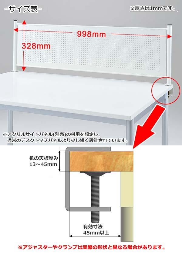スチール製のデスクトップパネルです♪スチール製なので、メモなどをマグネットで貼り付けることができます。取り付け方法はクランプ式を採用しており、デスクの端に金具で固定をするだけ!!パネルのパンチングは適度に明かりを取り入れ、明るい状態で視線を遮ります。配線などを通せるように、パネルの下に少し隙間を設けています。 |