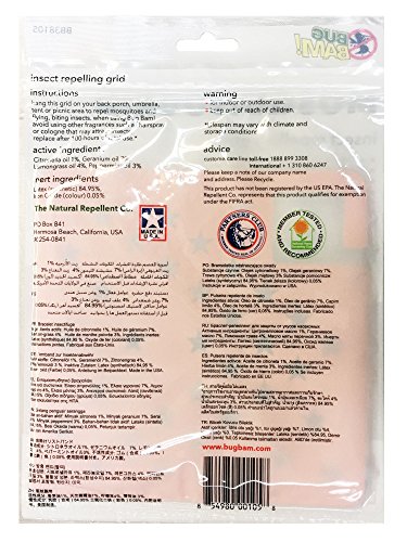 -. Brand : BugBam -. Color : Orange -. Department : Health and Wellness -. EAN : 0854980001058 -. Feature : MADE IN USA. 100% Natural active ingredients and GRAS materials. / Scientifically tested and proven to repel mosquitoes. / Works at up to 300 sq. ft. for up to 100 hours. / Waterproof. Comes in a resealable package. / 100% Recyclable. Safe for all ages. Great for any outdoor activity. -. IsAdultProduct : 0 -. Label : Bug Bam -. LegalDisclaimer : Bug Bam Products LLC are the only authorized Amazon reseller of Bug Bam products. -. Manufacturer : Bug Bam -. Model : BB38105 -. MPN : BB38105 -. PackageQuantity : 1 -. PartNumber : BB38105 -. ProductGroup : Lawn & Patio -. ProductTypeName : OUTDOOR_LIVING -. Publisher : Bug Bam -. Studio : Bug Bam -. Title : Bug Bam Insect Repelling Grid -. UPC : 854980001058