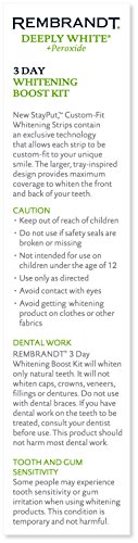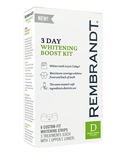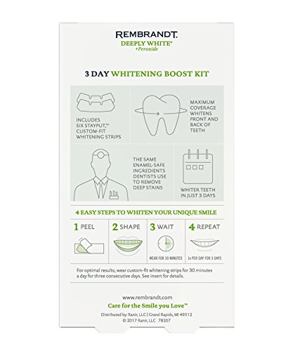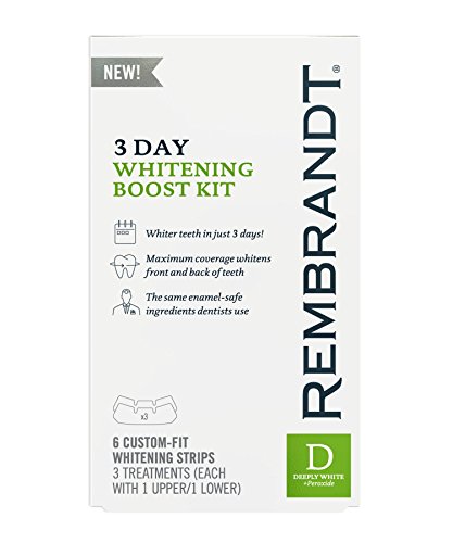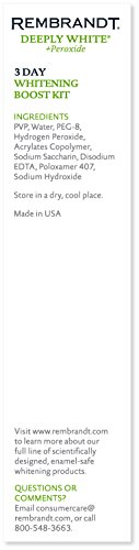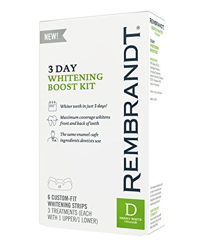 Designed for at-home use, REMBRANDT 3-Day Whitening Boost Kit provides a customized dentist-like whitening experience for a whiter, brighter smile. In just one two-hour treatment, this kit safely whitens deep stains for noticeably brighter teeth. The whitening kit contains exclusive COMFYTRAY applicators that conform to the unique shape of your teeth, and peroxide-based whitening gel that won't harm tooth enamel. Safe and effective, REMBRANDT 3 Day Whitening Boost Kit makes it fast and easy to feel confident about your smile.Feature