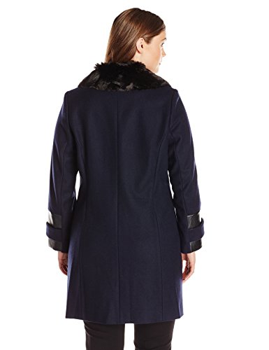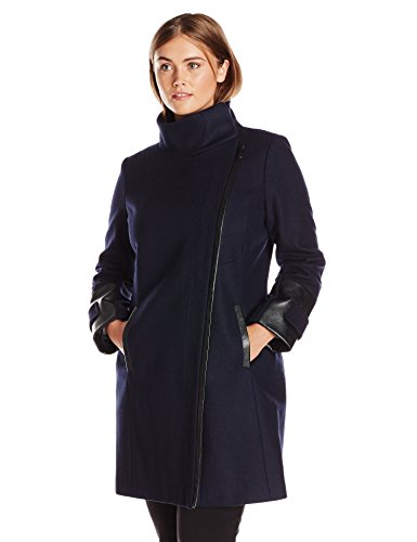 Plus size asymmetrical wool coat with faux leather detail. Luxe faux fur collar.