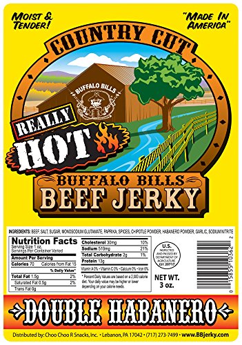 -. Feature : Our Double Habanero flavor Buffalo Bills Country Cut Beef Jerky in 2 size packs / Our hottest flavor - we took our Chipotle Habanero recipe and then doubled the amount of habanero / Easy to chew, thick cut, and extremely moist & tender - made in the USA with 100% US beef / USDA inspected and approved - only 2 carbs and 70 calories per 1oz serving / Our Country Cut Beef Jerky is available in 9 distinct flavors - all are moist and tender