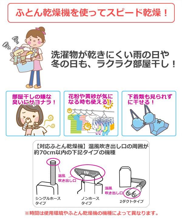 洗濯物が乾きにくい雨の日や冬の日も、ふとん乾燥機を使ってスピード乾燥!花粉や、黄砂が気になる時も室内乾燥できます。袋自体も洗濯機で、丸洗いできます。 |
