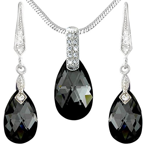 -. Binding : Jewelry -. Brand : Crystal Elegance UK -. Department : womens -. Feature : Designer piece - Beautiful and elegant tear drop earrings and pendant set made from Swarovski element crystals / Earrings measure 3.5cm drop down and 1cm (crystal width) x 1.5cm (length) approx. / Silver tone snake chain measures 38cm-40cm. Pendant crystal measures 1.5cm x 2cm approx / Comes with an elegant silver tone 5 row crystal studded bracelet. ( 1.4cm x 17cm approx) / Comes in a black and silver glitter effect gift box with black velvet sponge lining. -. Label : Crystal Elegance UK -. Manufacturer : Crystal Elegance UK -. Model : oiuy675 -. MPN : oiuy675 -. PartNumber : oiuy675 -. ProductGroup : Jewelry -. ProductTypeName : FASHIONNECKLACEBRACELETANKLET -. Publisher : Crystal Elegance UK -. Studio : Crystal Elegance UK -. Title : Black Crystal Silver Tone Drops Jewelry Set - Necklace Bracelet Earrings - Swarovski Elements Crystals