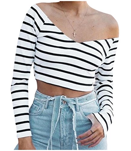 -. Title : Nicellyer Women's Crop Striped Long Sleeve Word Shoulder Blouse T-Shirt