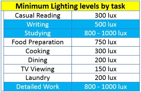 Brightness levels are measured in illuminance (Lux) not Watts. The more intense or detailed the work, the higher the lux required.