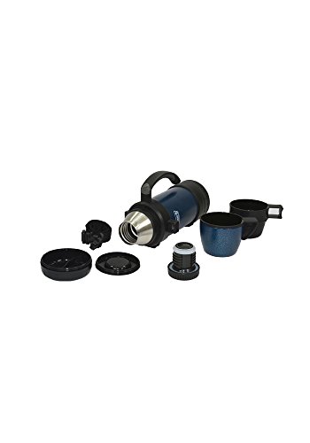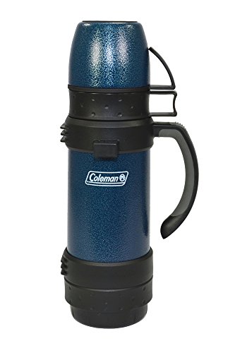 STAINLESS STEEL VACUUM BOTTLE, 1L. Vacuum sealed bottle keeps foods/liquids fresh and hot or cold. Features a sturdy handle and carry strap, 2 stainless steel cups, a stopper for easy pouring, and a base compartment to store food or condiments. Hammered FinishFeature