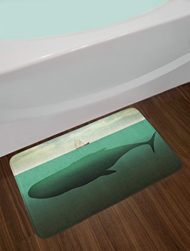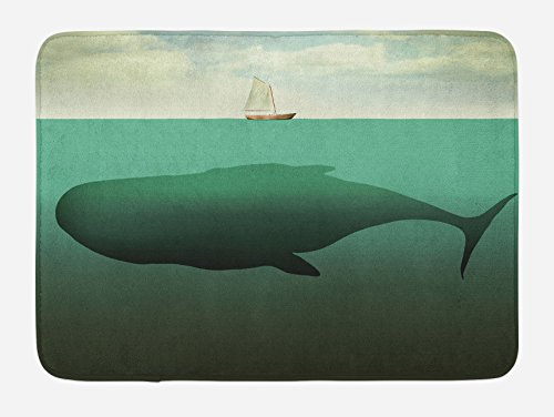 Fantasy Bath Mat by Ambesonne, Surreal Giant Whale in the Middle of Sea and Little Sailboat on the Surface Print, Plush Bathroom Decor Mat with Non Slip Backing, 29.5 W X 17.5 W Inches, Green Beige