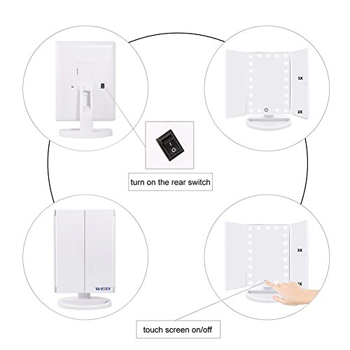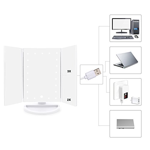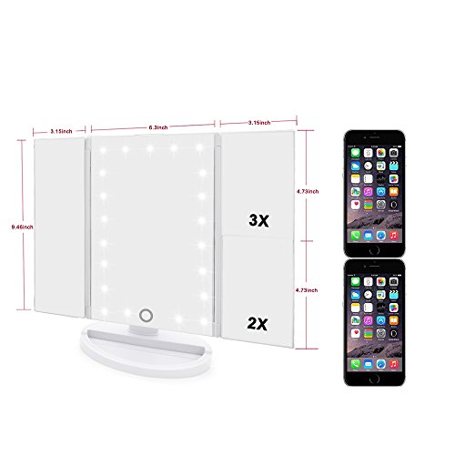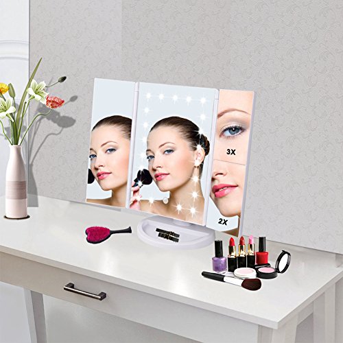 Lighted Makeup Mirror, Tri-fold Vanity Mirror with 3X/2X/1X Magnification,21 Natural LED Nights and Touch Screen, Batteries and USB Power Supply Adjustable Tabletop Cosmetic Mirror (White)