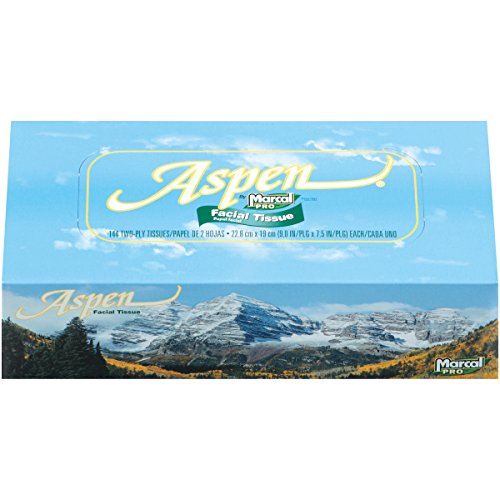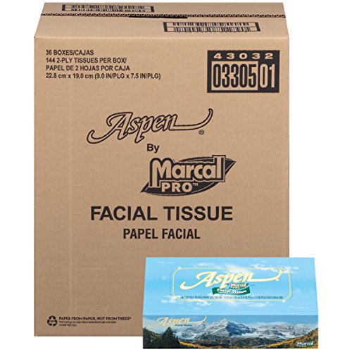Studio : Marcal Publisher : Marcal Binding : Misc. Product Description Marcal Pro Aspen #03305 100% Recycled 2-Ply Facial Tissue is hypoallergenic and virtually lint free. Manufactured using no chlorine bleach, dye or fragrances. Meets EPA Guidelines for recycled content making it the best choice. Packaged 144 facial tissues in a decorative box that works with any decor and is the perfect size for the vanity or desktop. 144 facial tissues per box, 36 boxes per carton. Made in the USA. Marcal, a friend to trees since 1950! We make paper from paper, not from trees! 0