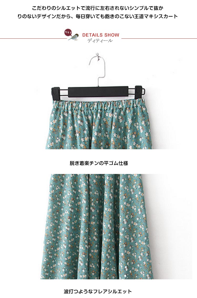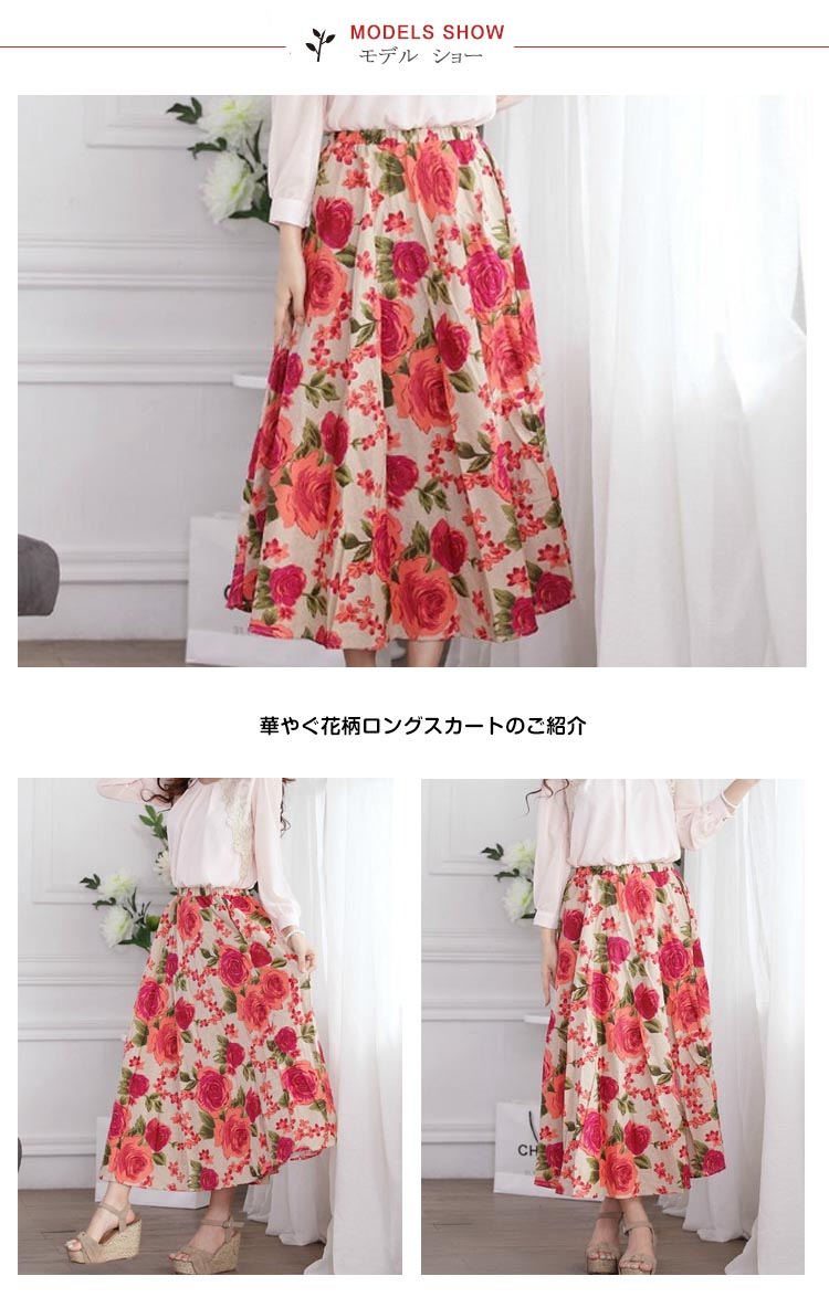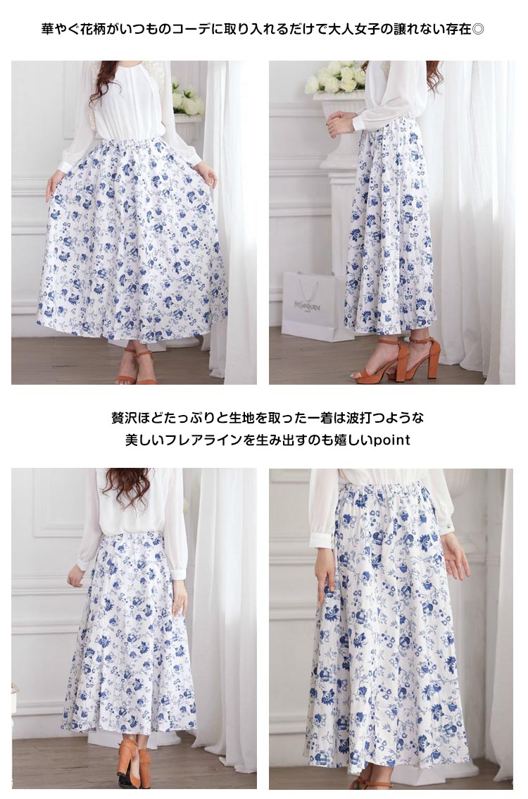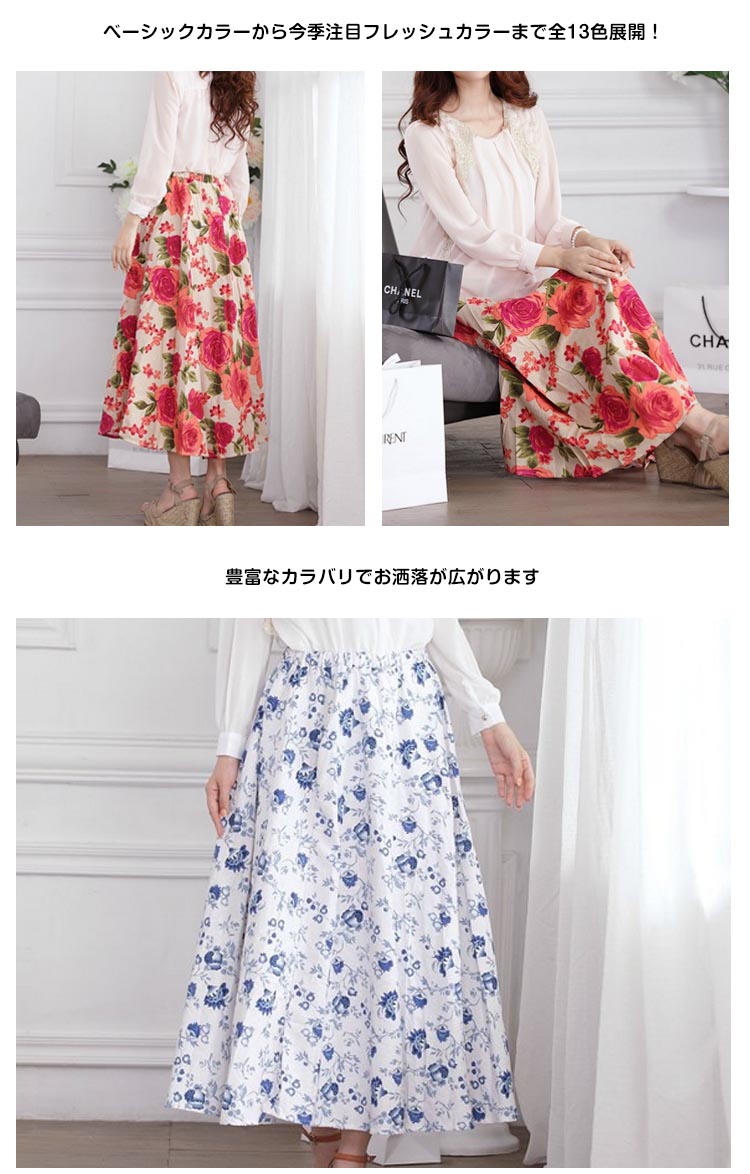 | 華やぐ花柄ロングスカートのご紹介ベーシックカラーから今季注目フレッシュカラーまで全13色展開!豊富なカラバリでお洒落が広がります華やぐ花柄がいつものコーデに取り入れるだけで大人女子の譲れない存在◎贅沢ほどたっぷりと生地を取った一着は波打つような美しいフレアラインを生み出すのも嬉しいpointこだわりのシルエットで流行に左右されないシンプルで抜かりのないデザインだから、毎日穿いても飽きのこない王道マキシスカート | |