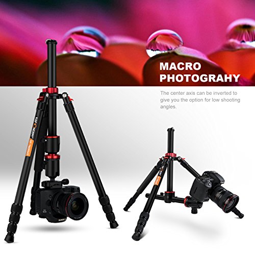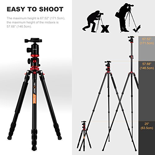 【Compact & Flexible】4 sections leg can adjust the height from 18.89'' to 66.53''; the N. weight with ball head is 4.38lbs; can be 180°reflexed, which is super portable with tripod carrying bag.