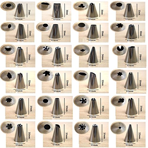 - Cake Decoration Tips Set include 24 Pcs 100% food-grade stainless steel tips, 2 reusable silicone pastry bag, 2 reusable plastic couplers, 2 flower nails, 1 Piping Cut, with which you can create all types of patterns on cake in a detachable carrying case.