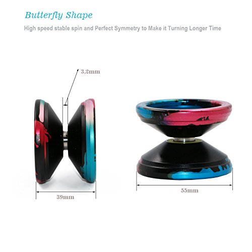 1.Body Shape :Butterfly 2.Body Material:Al 6061 3.Weight:66g 4.Diameter:55mm 5.Width:39mm 6.Gap Width:3.2mm 7.Bearing: 8ball flat bearing (size 6.35*12.7*3.175mm) 8.Axle:M4*8mm Stainless 9.Surface:Sand blasting finish 10.Style: String Trick (1A, 3A, 5A) 11.Response pad: Yellow Silicon Pad 12.Twist-apart :Twist-Apart Package include: 1 x Magic YoYo V6 Black Blue Red Splashes 5 x String(color random) 1 x Gloves 1x yoyo bag