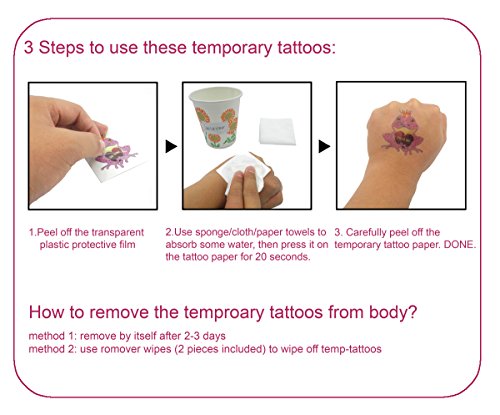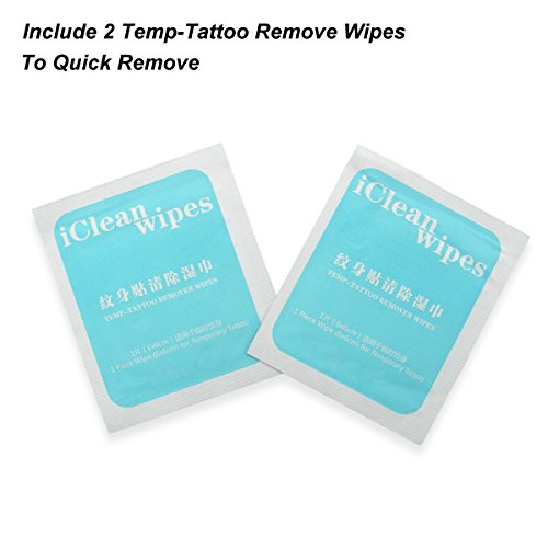 How to Remove ? method 1: remove by itself after 2-3 days method 2: use remover wipes (2 Pieces included) to wipe off the temp-tattoos.