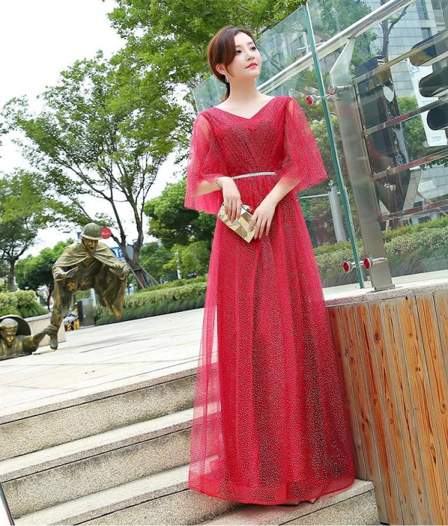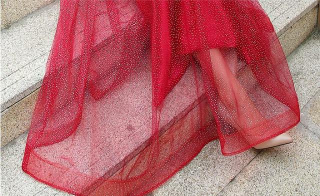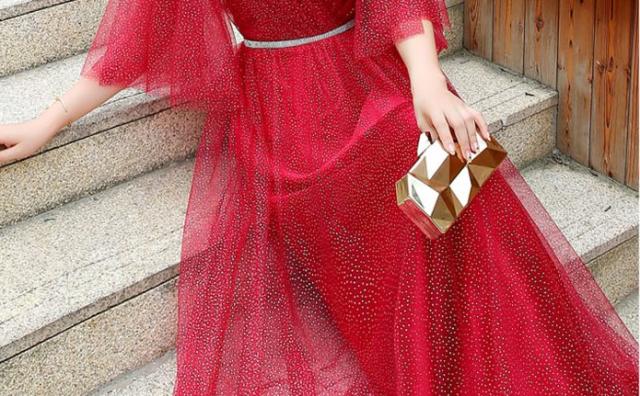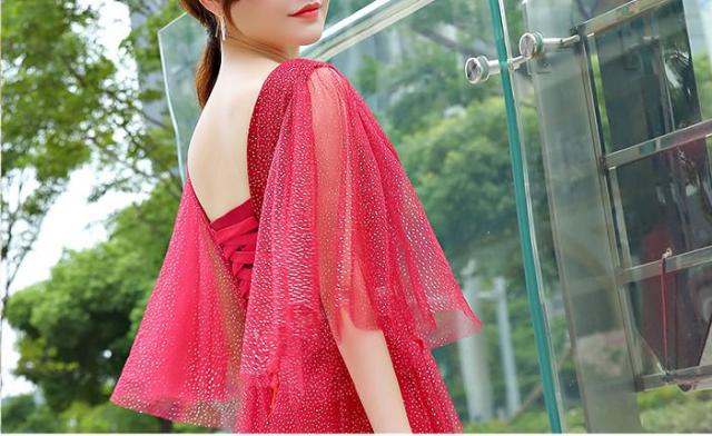 ゴールドのドットを万べなく柔らかいレース生地に施した上品なパーティードレス。
