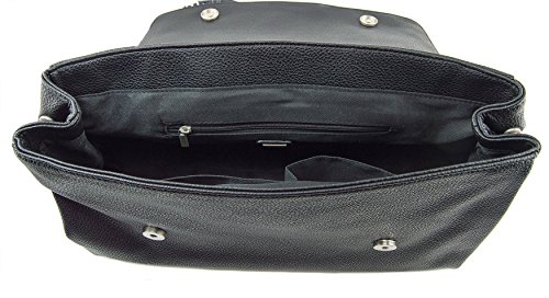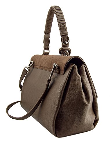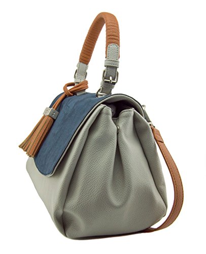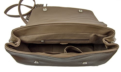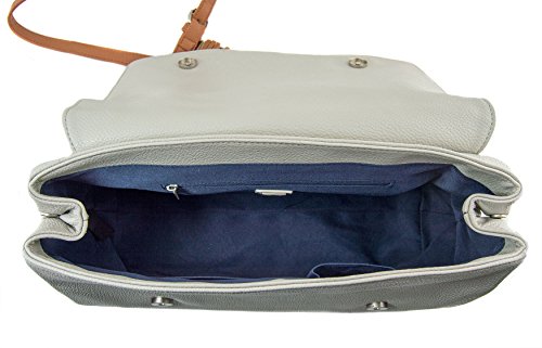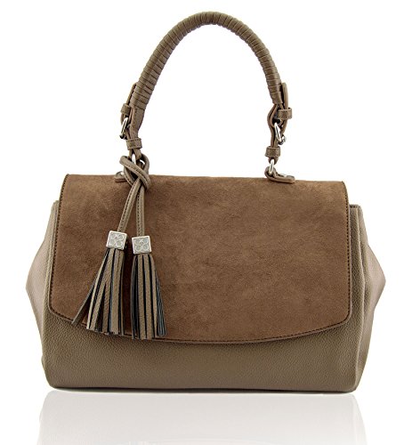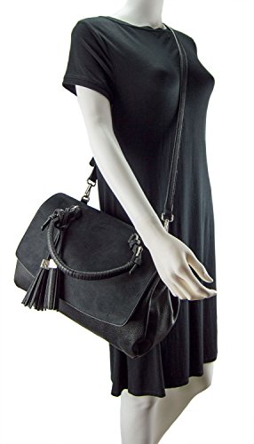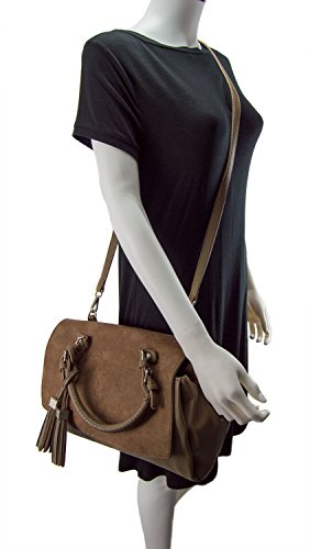 -. Feature : Rich pebble vegan leather w/faux suede flap / Interior zip compartment, 2 Interior slide pockets / Secure magnetic flap closure, distinctive tassel detail / 13"W x 10"H x 6"D / 6" designer wrapped handle