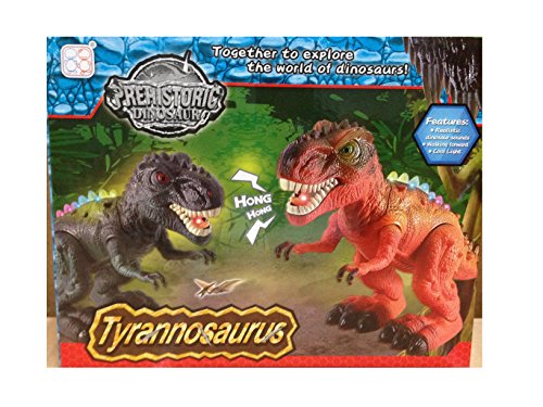 This toy gives kids all the sounds and action of a real Tyrannosaurus Rex Dinosaur. Run after the T-Rex as he stomps the ground and walks around by himself. Designed to emulate a real prehistoric animal to make it fun for all ages. The dinosaur noises and bright multi-colored lights add that extra spark you wont find in other toys! It requires 3 AA batteries (not included) and is made from non-toxic ABS plastic.Feature