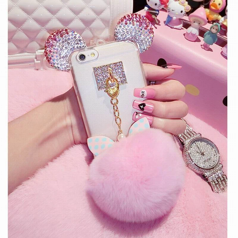 Size:New Shining Rhinestone Lovely Mouse Ears Bow Metal Ring Fur Ball Case