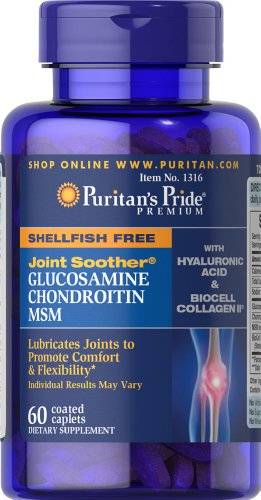 Studio : Puritan's Pride Publisher : Puritan's Pride Binding : Health and Beauty Product Description Hyaluronic Acid, Biocell Collagen II, Glucosamine, Chondroitin. Glucosamine and Chondroitin help provide the building blocks for cartilage. Healthy cartilage helps promote mobility, range of motion and flexibility. This comprehensive formula is specially designed to help ease occasional joint stress due to exercise or physical activity. MSM (Methylsulfonylmethane) provides a source of sulfur. Sulfur is a mineral that helps support healthy collagen, connective tissue, joint cartilage and joint mobility. MSM works synergistically to help the benefits of glucosamine and chondroitin. This formulation also provides Hyaluronic Acid and BioCell Collagen II. Individual results may vary. Includes 60 coated caplets. BioCell Collagen is a registered trademark of BioCell Technology LLC, Newport Beach, California USA (US Patents 6,025,327, 6,323,319, 6,780,841, 7,091,180, 7,799,348 and other US and foreign patents pending). ** These statements have not been evaluated by the Food and Drug Administration. These products are not intended to diagnose, treat, cure or prevent any disease. 0