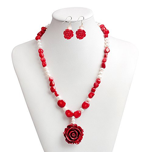 -. Title : 18" Simulated Red Coral Cultured Freshwater Pearl Carved Rose Necklace + Earring