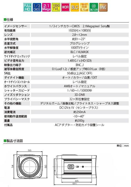 フルHD1920×1080pの解像度のHD-SDIカメラです。WDR(ワイドダイナミックレンジ)機能により明度の差が大きい撮影場所でも鮮明かつ自然な映像が撮影可能です。 |