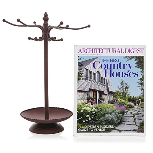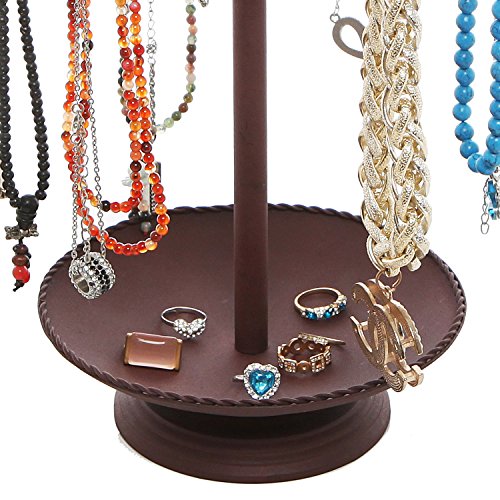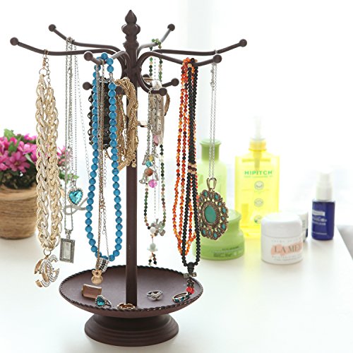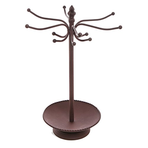 Vintage Style Brown Metal 12 Hook Jewelry Organizer Tree Rack Stand w/ Ring Dish Tray