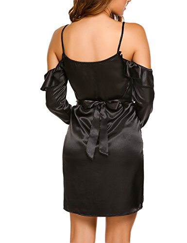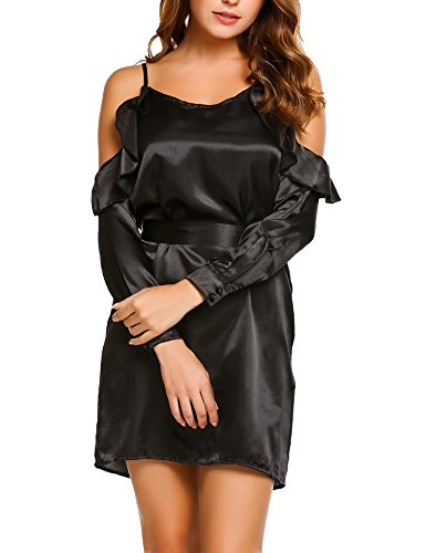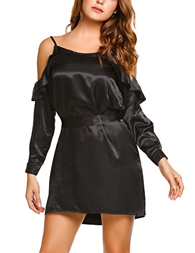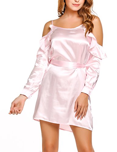 Zeagoo Women Cold Shoulder Ruffles Long Sleeve Satin Casual Loose Dress with Belt