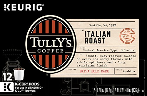 VARIETY DESCRIPTION: Complex and robust. A perfect example of Tully's slow-roasting philosophy. Italian Roast is the kind of coffee you'll find if you're lucky enough to get to Southern Italy. Full-bodied and intense, it has a subtle spiciness and a long, satisfying finish. Made with 100% Arabica coffee.