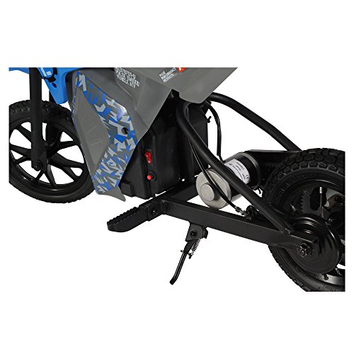 The EM-1000 E-Motorcycle from Pulse Performance Products allows riders to break free from the pavement and enjoy off-road shredding performance at up to 10 mph! Perfect for a child's first motorbike, the EM-1000 features 100 watts of power and a chain driven motor that delivers up to 40 minutes of continuous ride time on the 24-volt rechargeable battery system. The Instant Throttle Response (ITR) moto-inspired twist throttle brings instant acceleration and a caliper hand brake activates the rear drum brake for quick, safe stopping. A reinforced steel frame, fork, and handlebars enhance the motorcycle's durability while the puncture-proof knobby front tire and the air-filled knobby rear tire absorb all of the bumps. A simple LED light on/off indicator for safety and a power converter for charging is included. Designed for riders 8 years and older, weighing up to 120 pounds.Feature