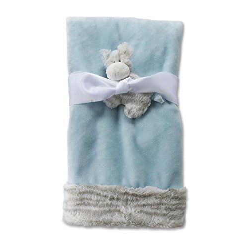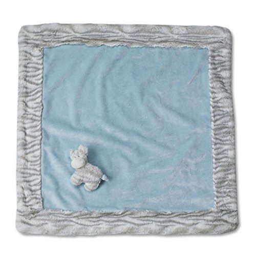 Blue blanket with grey and white zebra trim, with a zebra rattle