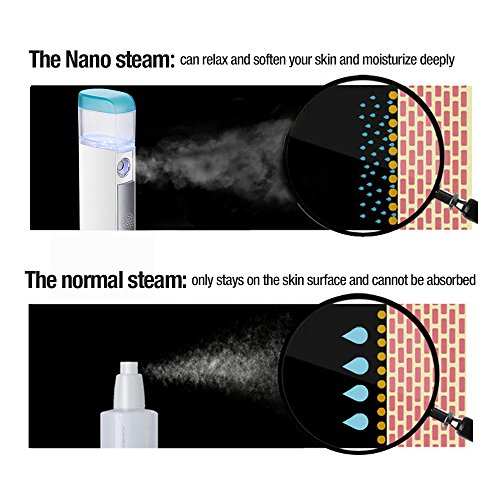 - 1.Removing Dirt, Calming and Refreshing Skin: Also it can provide the necessary humidity to help you set and refresh your make-up. Skin may suffer from stimulation, pain and itches after sunburn. The steam can relax and soften your skin and moisturize deeply to helps skin cool down and recover to normal. Also nano mister can relax, soothe tired skin instantly, reducing wrinkles, relieving skin sensitive, deep moisturizing to make your skin soft and full of elasticity.