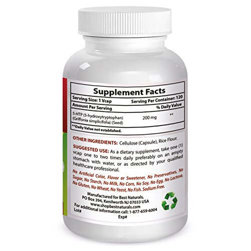 -. Binding : Health and Beauty -. Brand : Best Naturals -. EAN : 0746122962108 -. Feature : Neurotransmitter Support / Supports positive mood / Supports relaxation & restful sleep / Supports appetite control / All Best Naturals products are manufactured in accordance with Good Manufacturing Practices (GMP), among the highest standards in the world -- Proudly Made in USA -- Purity & Potency Guaranteed -. IsAdultProduct : 0 -. Label : Best Naturals -. Manufacturer : Best Naturals -. MPN : 614447 -. PackageQuantity : 1 -. PartNumber : 614447 -. ProductGroup : Health and Beauty -. ProductTypeName : HEALTH_PERSONAL_CARE -. Publisher : Best Naturals -. Studio : Best Naturals -. Title : Best Naturals 5-HTP 200 Mg 120 Vcaps -. UPC : 746122962108