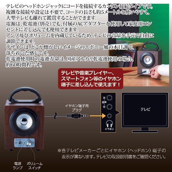 テレビのヘッドホンジャックにコードを接続するカンタン接続タイプです。複雑な接続や設定は不要で、コードの長さも約5メートルと使いやすく、大型テレビも離れて鑑賞することができます。電源は、乾電池(別売)でも、付属のACアダプターを使用して家庭用コンセントに差し込んでも使用できます。アンプ及びボリュームを内蔵しているため、テレビの音量を手元で自由に調節できます。デザインは、どこか懐かしいイメージのエボニー風の木目調で、落ち着いた感じです。乾電池使用時の電池寿命は、国産アルカリ乾電池使用の場合、約60時間程です。