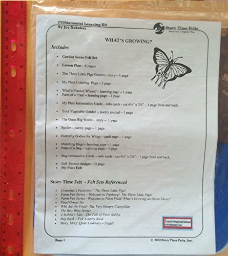 -. Binding : Toy -. EAN : 0603016100766 -. Feature : Precut and ready to use! / includes:felt figures, mini overlay, myplate overlay, and literature(flannel board not included) / Perfect for home or school, made in the USA / Great for ages 3-12 years / Perfect educational toys great for creative learning and fun play. Can be used again and again! -. IsAdultProduct : 0 -. Label : Story Time Felts -. Manufacturer : Story Time Felts -. Model : 47033 -. PackageQuantity : 1 -. ProductGroup : Toy -. ProductTypeName : TOYS_AND_GAMES -. Publisher : Story Time Felts -. Studio : Story Time Felts -. Title : What's Growing? Vegetable Learning Kit Felt Figures for Flannelboard Stories-precut Ready to Use -. UPC : 603016100766