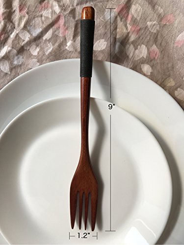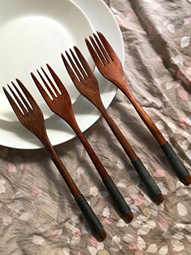 Natural Lacquer Coating Handmade Japanese Phoebe Solid Wood Dinner Fork 4 pcs with String Wrapped - Safe, Eco-friendly - 9” x 1.2’’