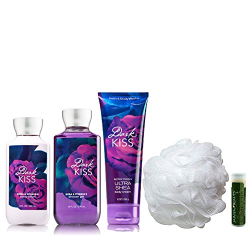 DARK KISS Bath & Body Works Deluxe 5 Piece Set of Lotion, Gel, Cream & Shower Puff with a Jarosa Bee Organic Peppermint Lip Balm by Jarosa Gifts